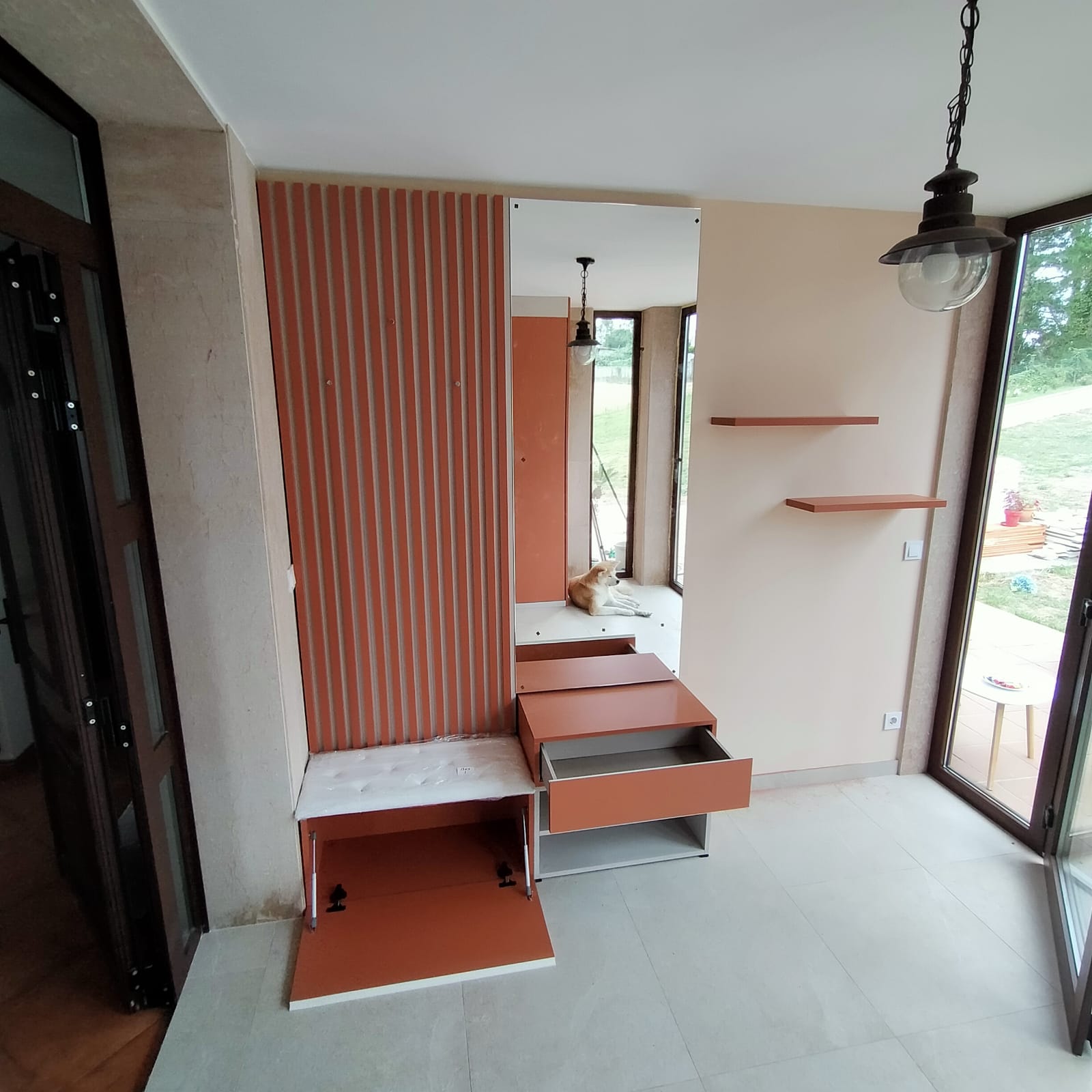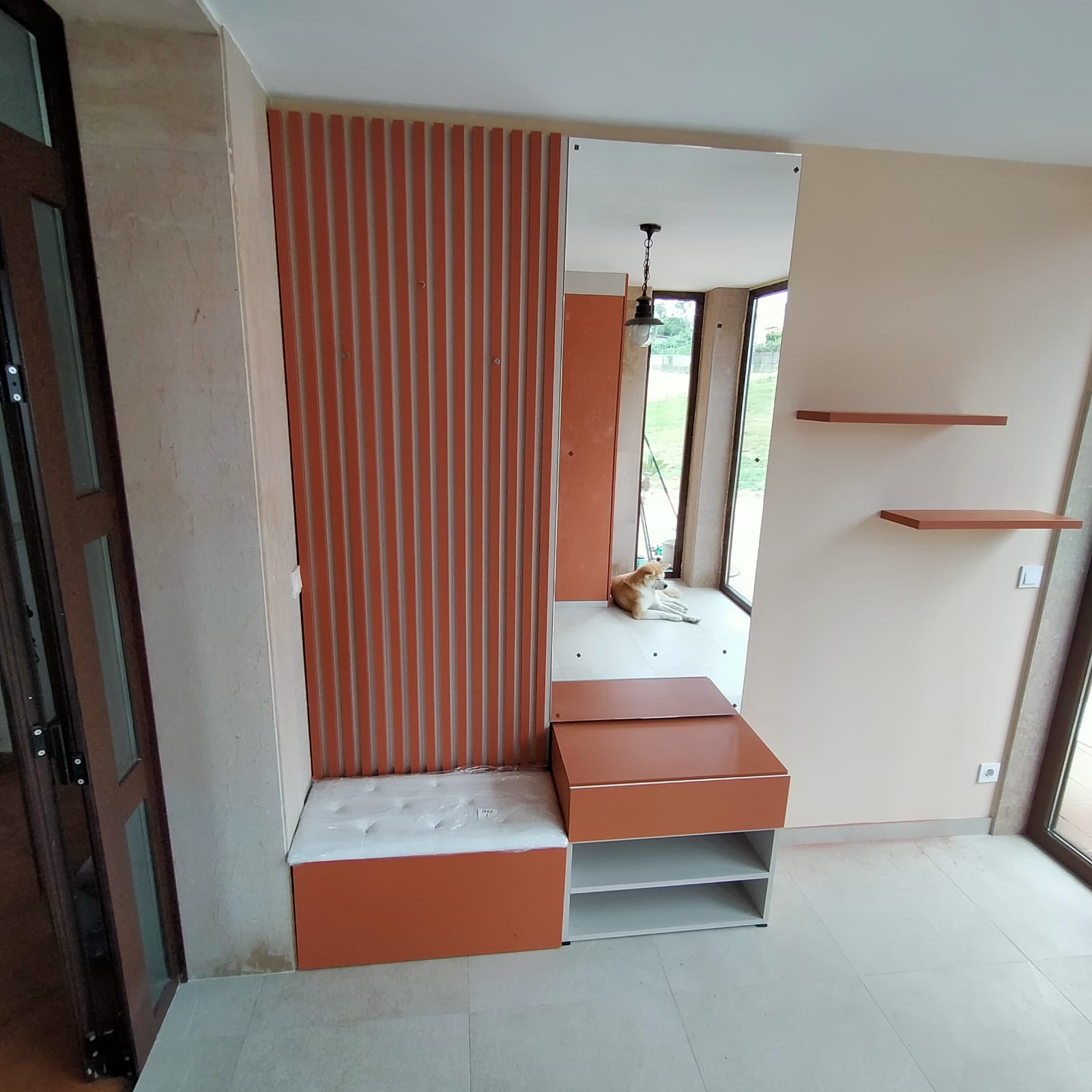 Además, en la última zona de este recibidor se instalaron dos baldas horizontales sin soportes, terminando de completar la pared.